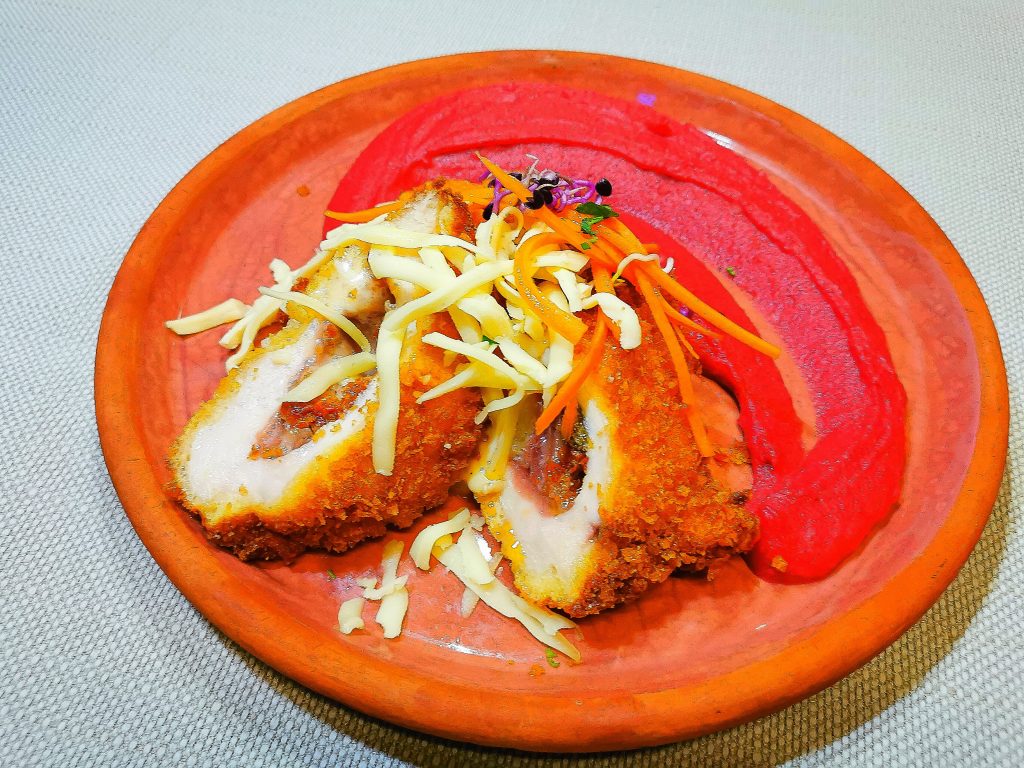 Mozarellával, kiváló olasz prosciuttoval és aszalt paradicsommal töltjük meg a jércemellet, melyet ropogós bundában sütünk meg, s amit aztán céklás burgonyapürével tálalunk.